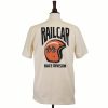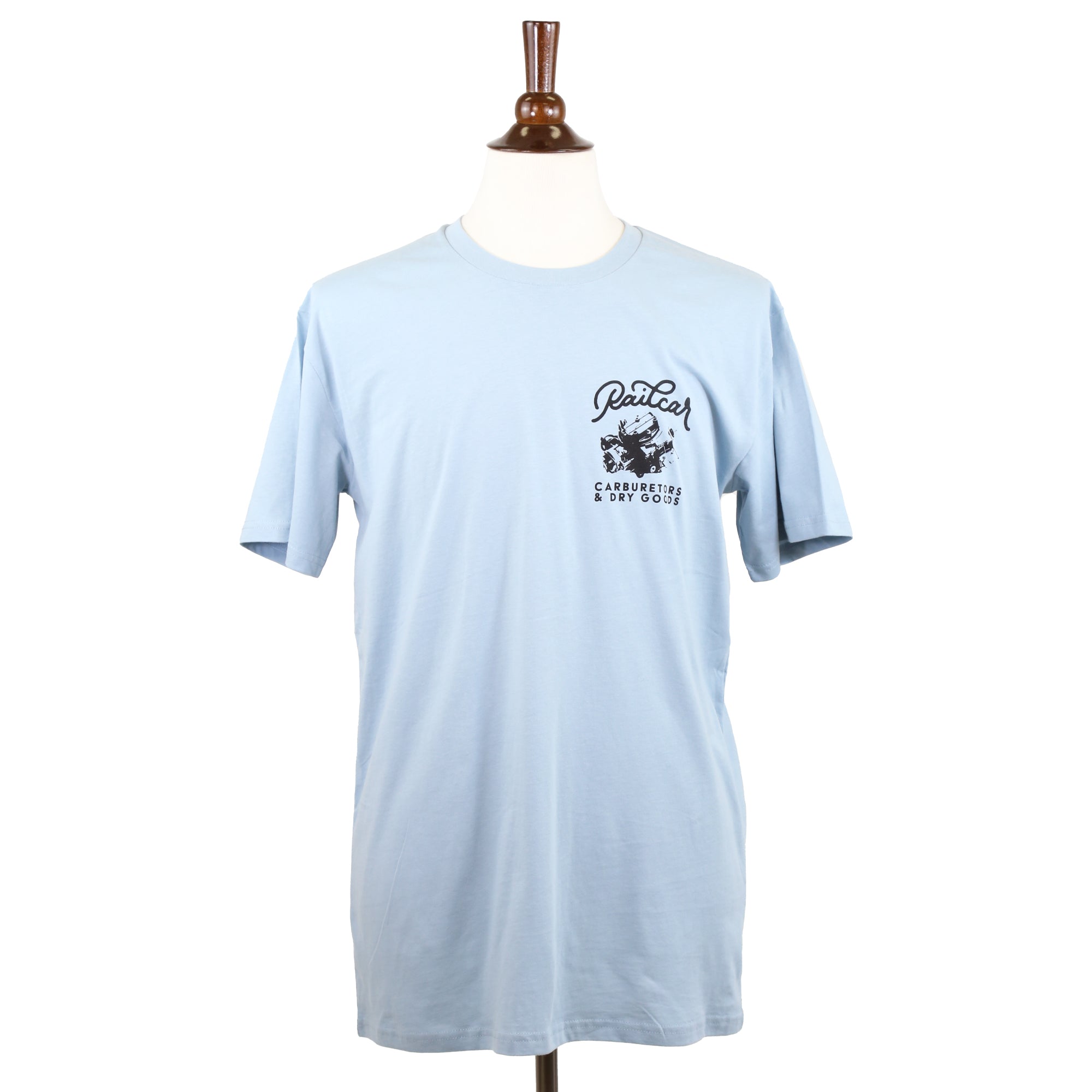 Railcar Carburetors And Dry Goods artist graphic 5 ounce white color premium tee shirt. Screen printed in-house