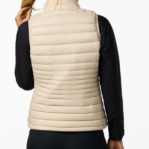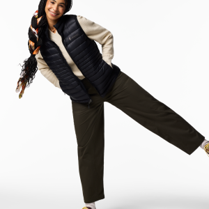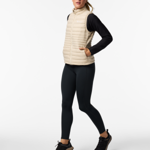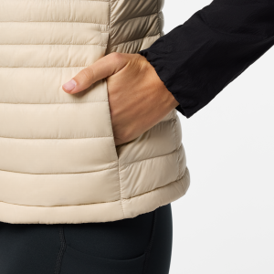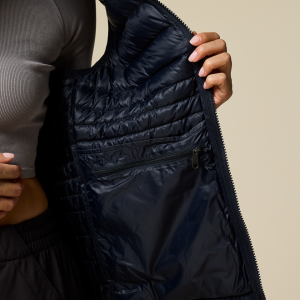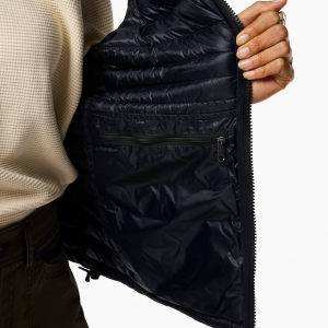 A classic down vest made from recycled fabric with year-round versatility