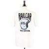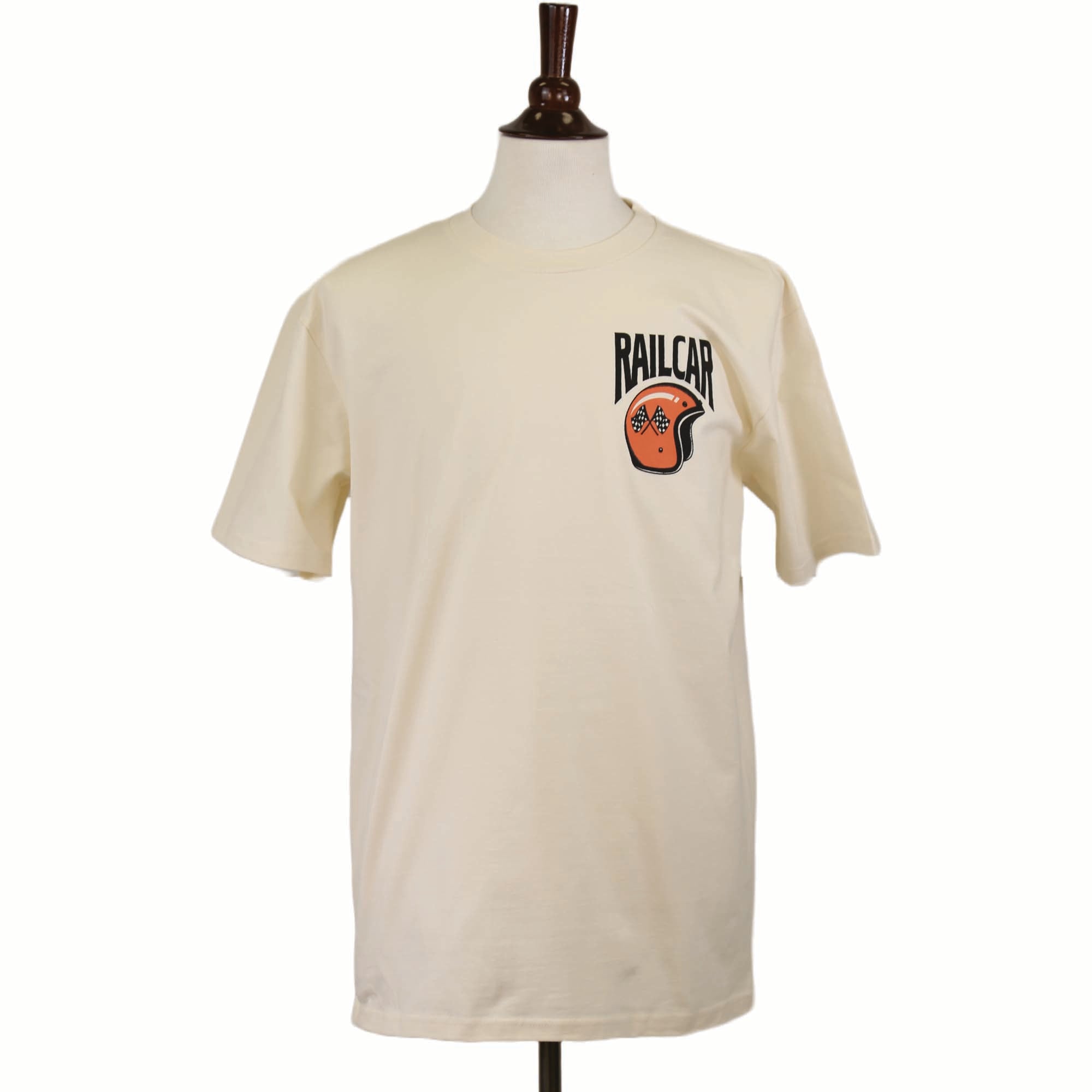 Railcar Helmet Race Division artist graphic 6.4 ounce natural ecru color premium tee shirt. Screen printed in-house