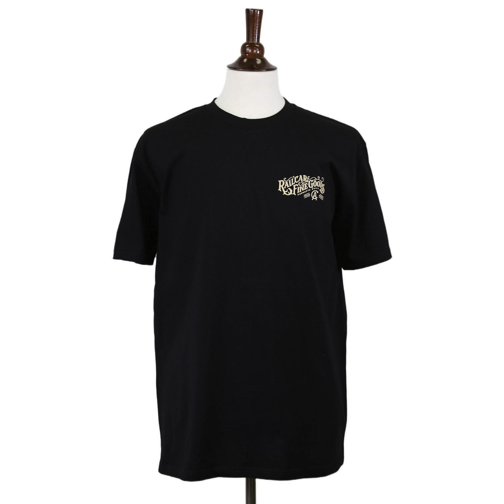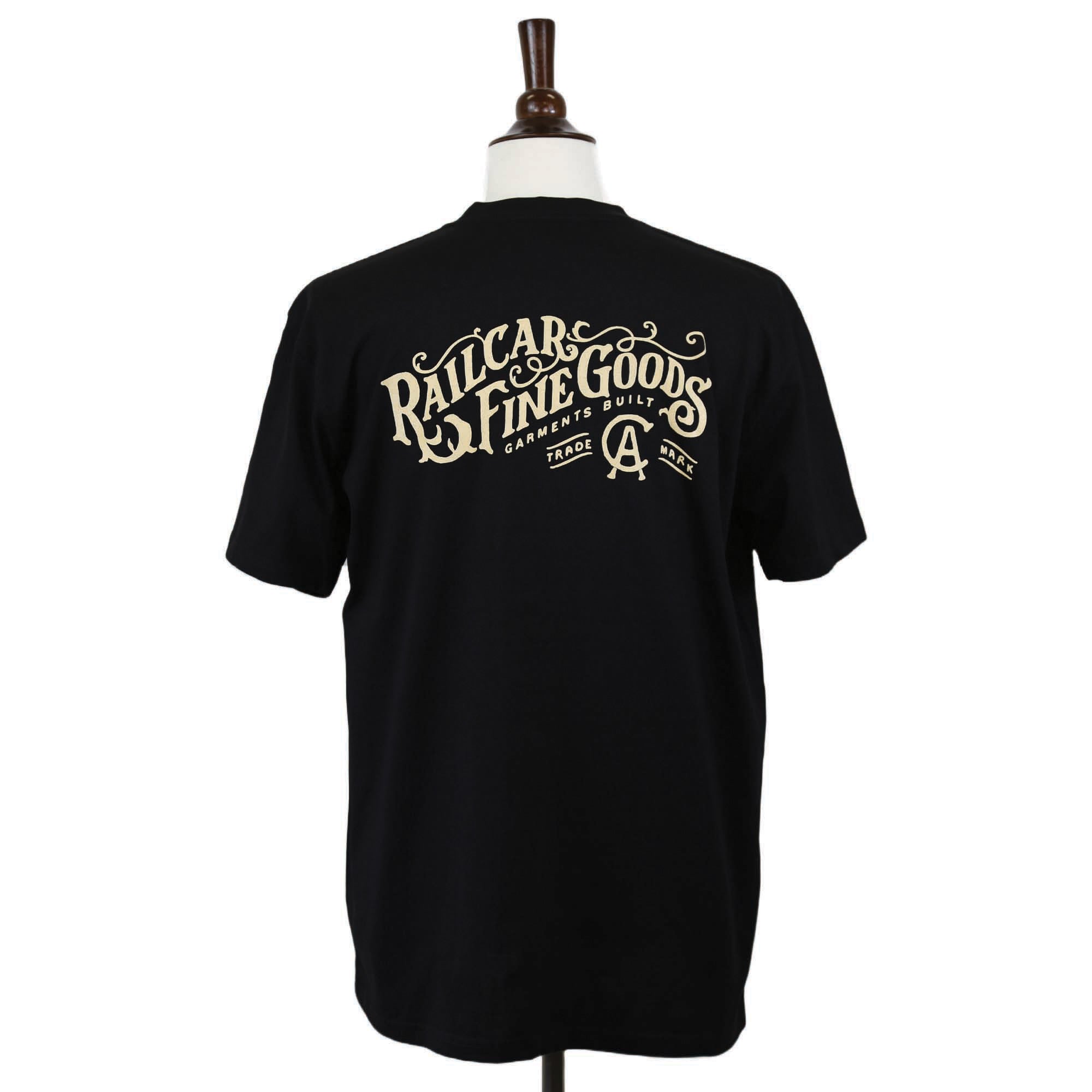 Railcar Typography Logo artist graphic printed on a 6.4 ounce black premium tee shirt.